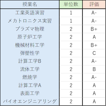 それなりに狙っていた科目はすべて良い評価を取れたのですが、A+が1つもなかったのが悔しいです。プラズマ、機械材料はA帯を狙っていましたし、計算工学、燃焼学、表面工学、バイオあたりはA+を狙っていたので、思ったより低くて少し残念でした。