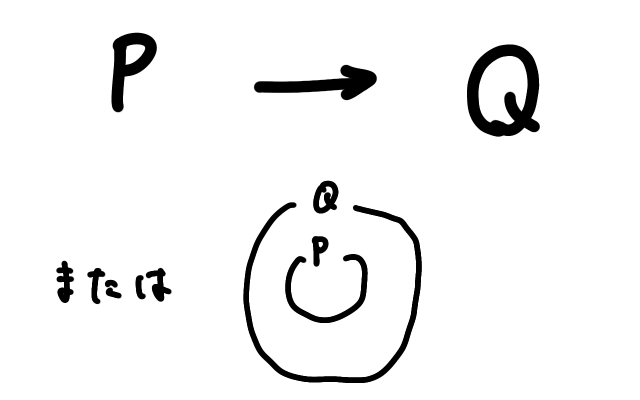 「必要条件と十分条件てのがあって、『PはQの十分条件』というのはPの時に絶対Qが成り立つことなんだ。そして『QはPの必要条件』て言うとQはPである時に絶対に満たしていなければならないということなんだ。」