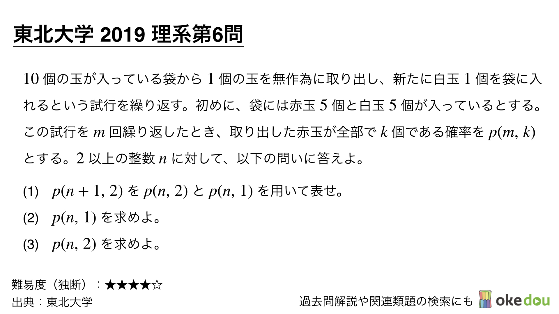 今日は、東北大学2019年理系第6問について、深く掘り下げて解説します。問題はこちらです、まずは是非自力でチャレンジしてみましょう!