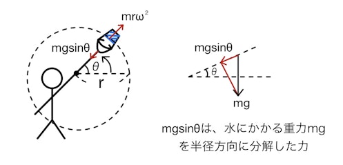 図から分かるように、水に対して、内向きの半径方向にはたらく重力はmgsinθ、外向きにはたらく遠心力はmrω^2です。遠心力の方が大きいときは、水はこぼれません。大小が切り替わると、こぼれるようになります。