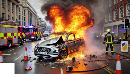 (ヒョンデのBEVが衝突後3秒で発火し鎮火に7時間を要し2名が亡くなった事故のイメージ図)