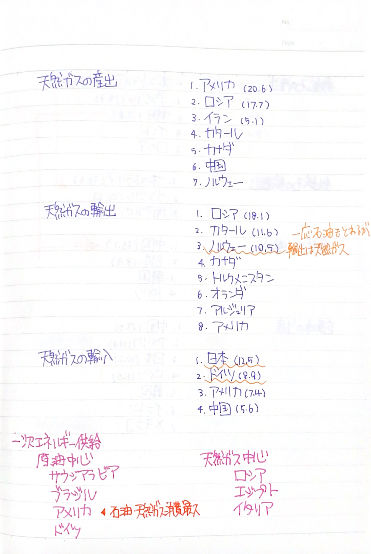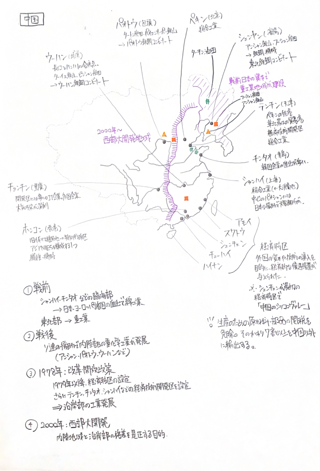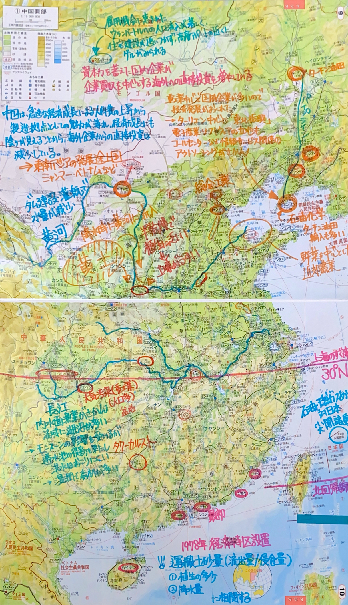 地理の暗記ですが、個人的には、一問一答形式や空欄補充形式を用いて単語のひとつひとつをチマチマ覚えていくのよりも、「自分で図表を書いてまとめる」「地図帳に必要な情報を書き込む」のほうが記憶に残りやすかったような気がします。文章だらけの世界史とは異なり、地理は図表を絡めやすい教科ですからね、下に添付している写真のように白地図や地図帳にアレコレ書き込んで、そしてそれを「目で見たままを暗記する」のがおすすめです。いわゆる写真記憶とか場所記憶とか、そういうイメージですね。
