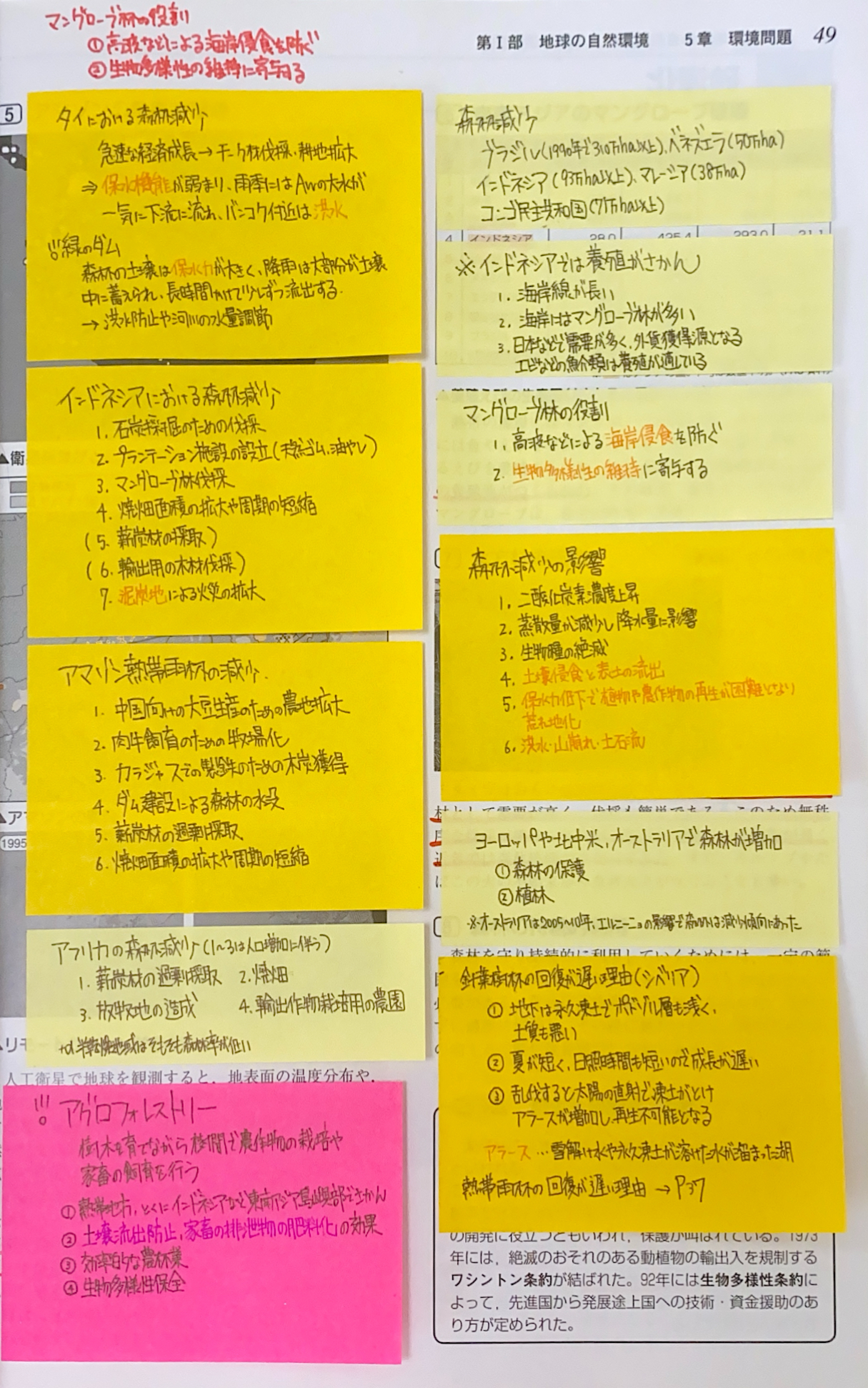 ちなみに、熱帯雨林が減少する理由は、東南アジアなら「石炭採掘のための伐採/天然ゴムや油やしなどのプランテーション施設の設立/マングローブ林の伐採/輸出用の木材伐採/泥炭地による火災の拡大/焼畑面積の拡大やその周期の短縮/薪炭材の採取」、アマゾンのほうなら「中国向けの大豆生産のための農地拡大/肉牛飼育のための牧場化/製鉄のための木炭獲得/ダム建設による森林の水没/焼畑面積の拡大やその周期の短縮/薪炭材の採取」、アフリカなら…という感じでまとめていて、問われたらこれらがパッと頭に思い浮かぶ状態にしていました。もっと言うと、森林が減少して何が起こるかリストもありましたね。「二酸化炭素濃度の上昇/蒸散量減少で降水量に影響/生物種の絶滅/土壌侵食と表土の流出/保水力低下で植物や農作物の再生が困難になり荒地化/洪水•山崩れ•土石流」とかとか。