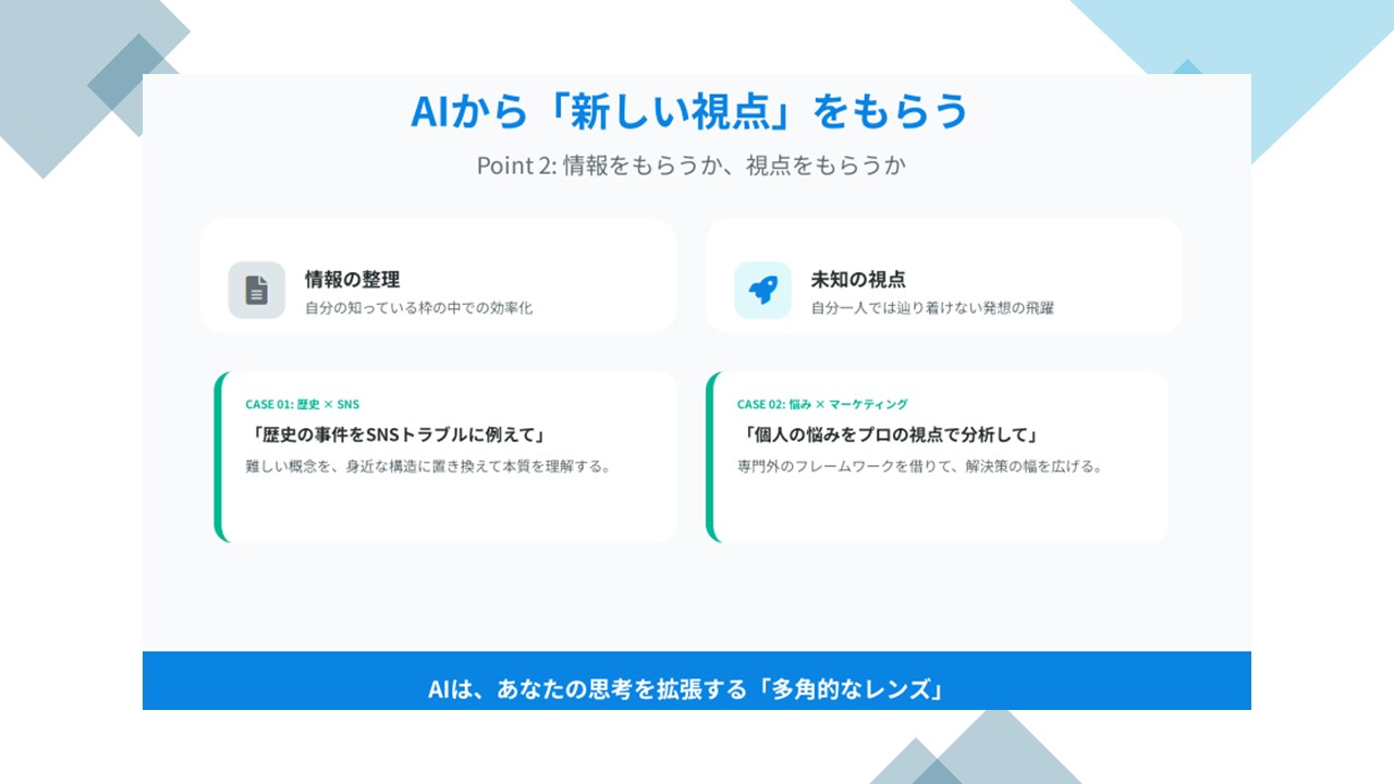 2.「情報」をもらうか、「視点」をもらうか AIは、自分が思いつかないような「別の視点」をくれます。