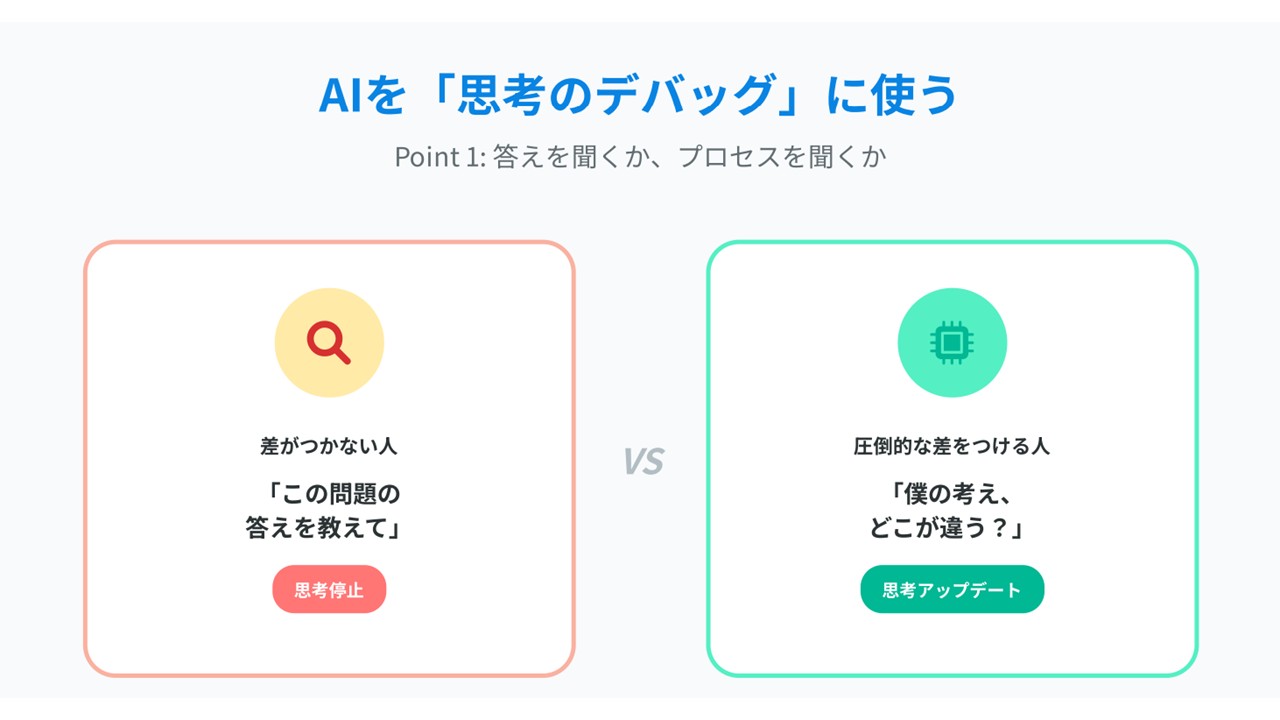 圧倒的な差をつける人は、「この問題、僕はこう考えたんだけど、どこが間違っているかな? ヒントを教えて」と聞きます。AIを「答え合わせのマシン」ではなく、自分の思考のバグを見つける「デバッグツール」にしているんです。