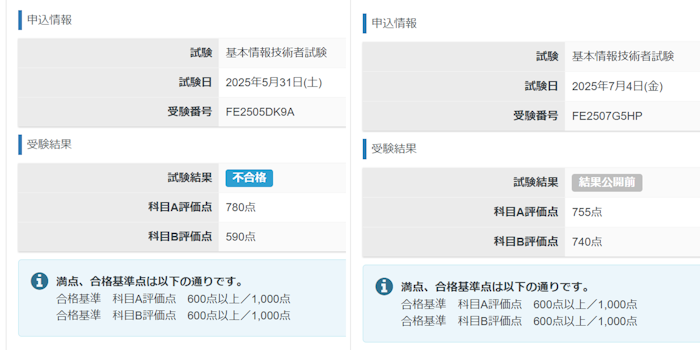見ての通り、1回目は科目Aの点数は良かったのですが、科目Bの点数が10点足りずに落ちてしまいました。