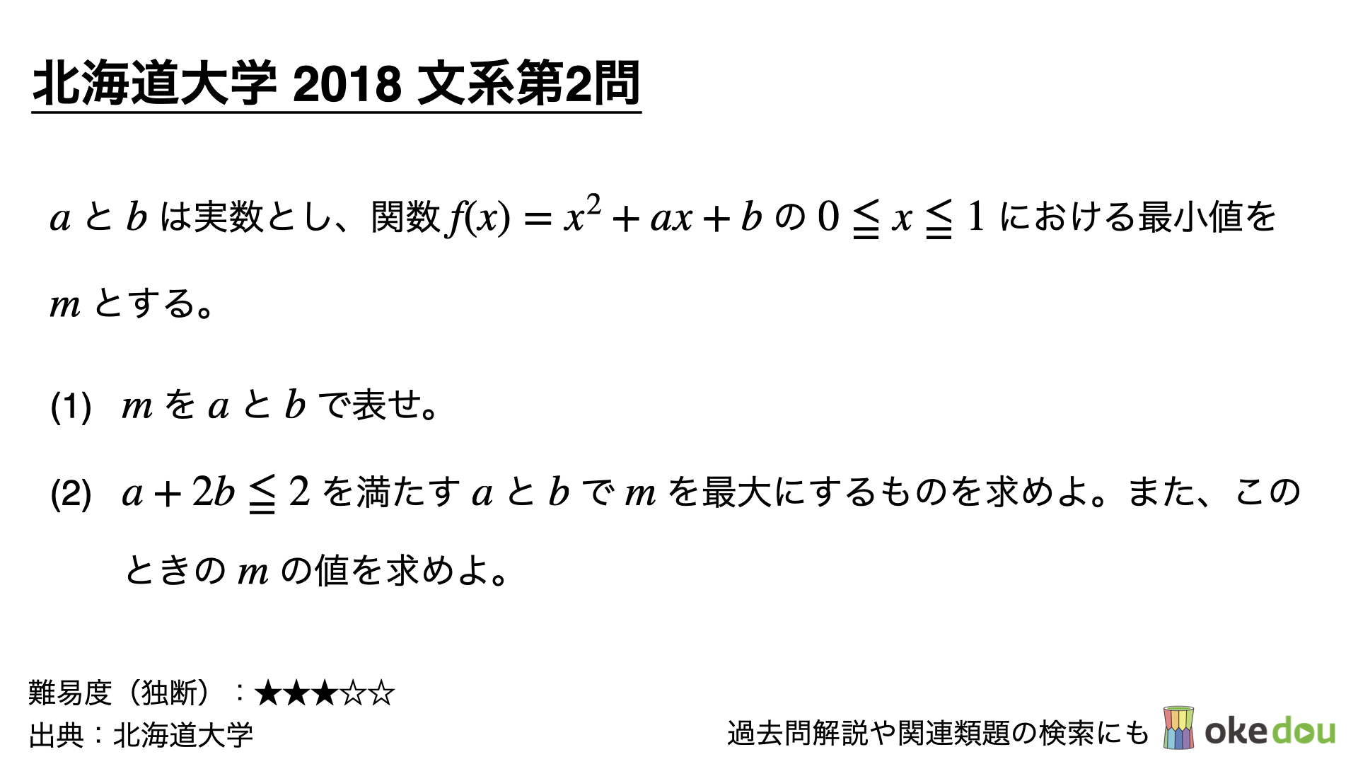 今日は、北海道大学2018年文系第2問について、他の問題にも応用が効くように、深く解説してみます。