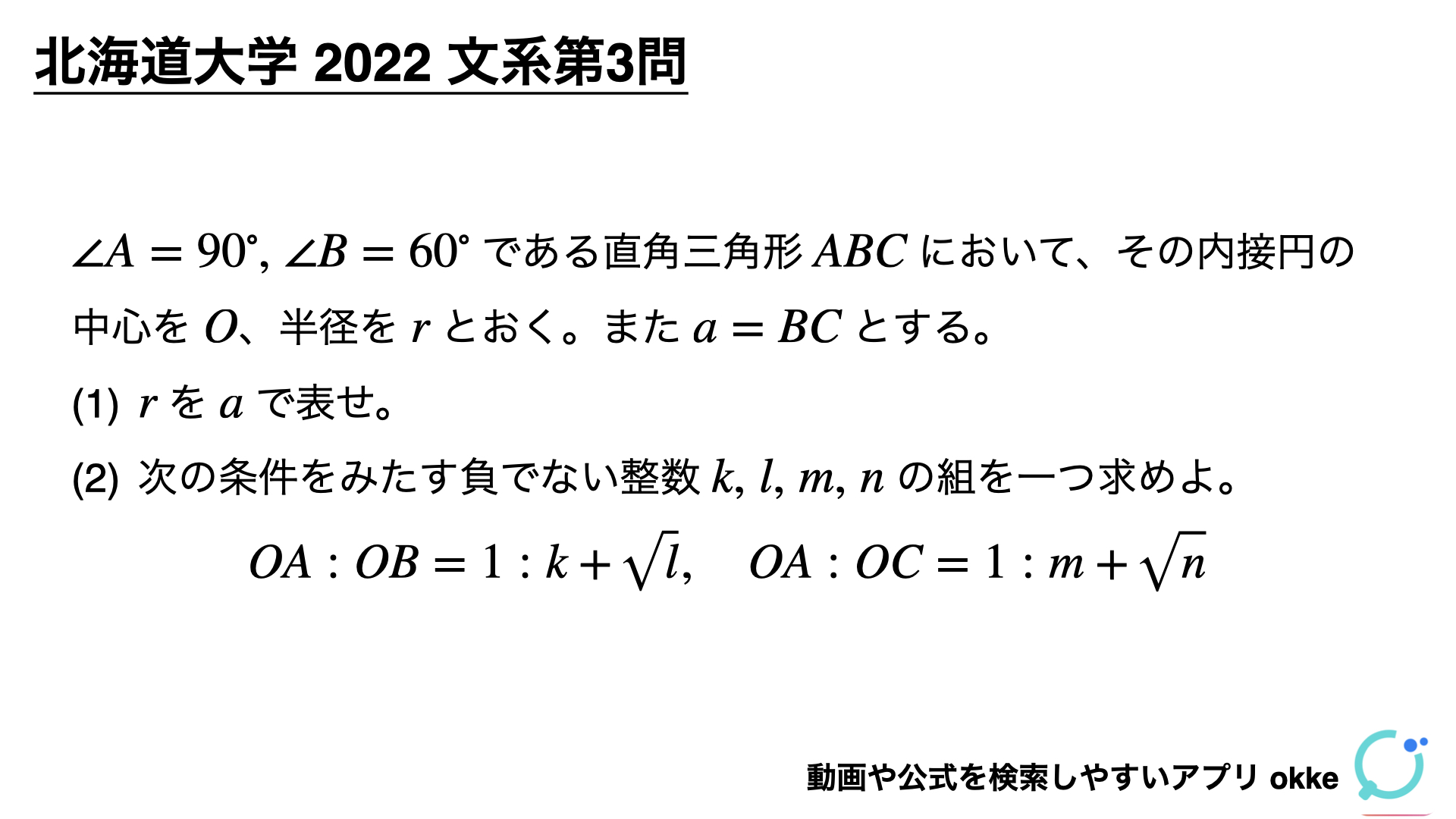 今日は、北海道大学2022年文系第3問の平面図形の問題について、他の問題にも応用が効くように深くわかりやすく解説します。