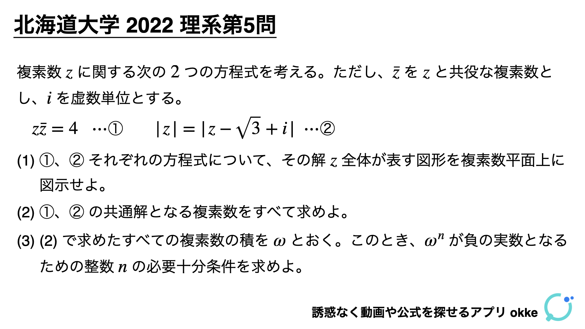 今日は、北海道大学2022年理系第5問の複素数平面の良問について、他の問題にも応用が効くように深くわかりやすく解説します。