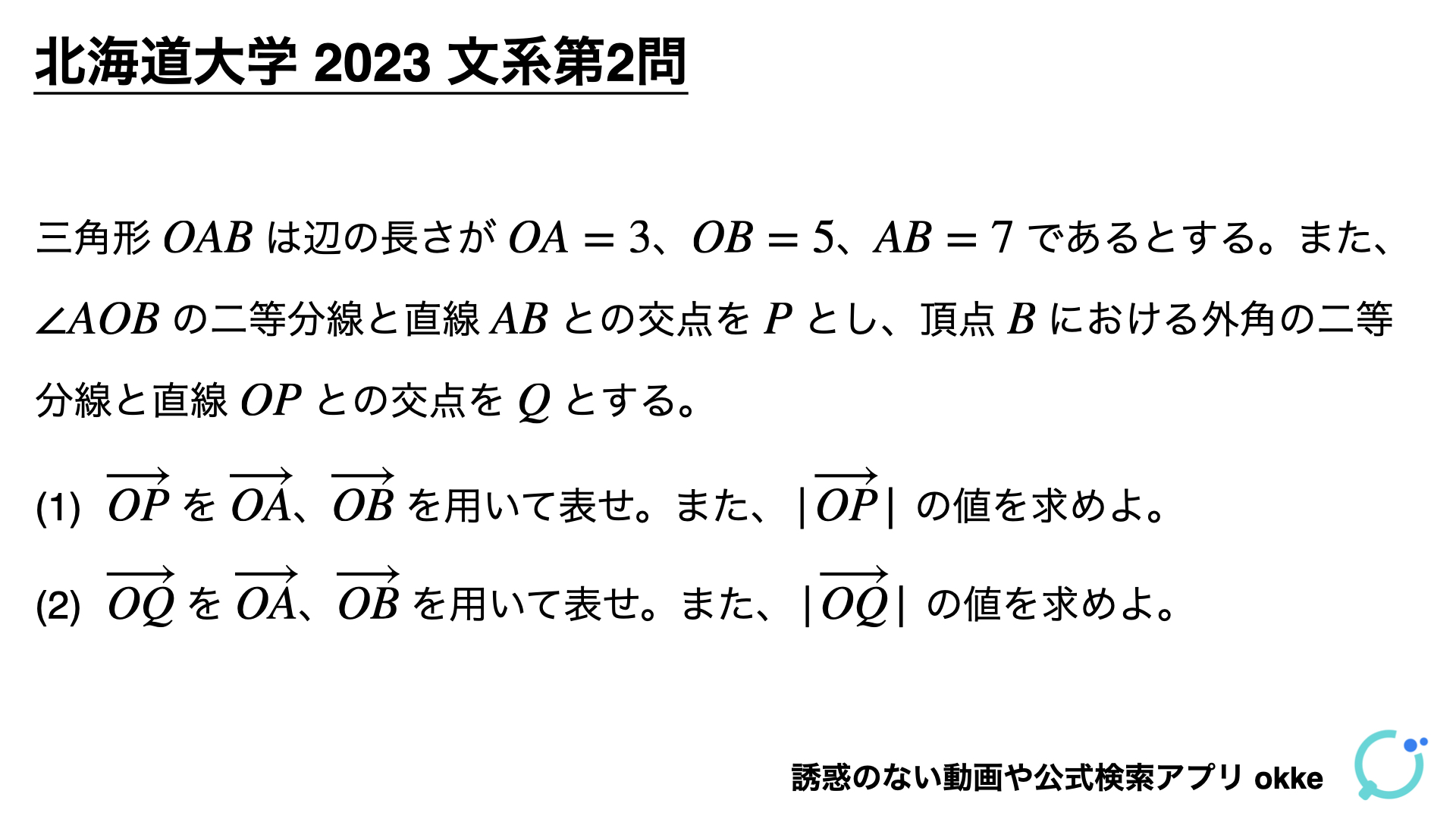 今日は、北海道大学2023年文系第2問の平面ベクトルの問題について、他の問題にも応用が効くように深くわかりやすく解説します。