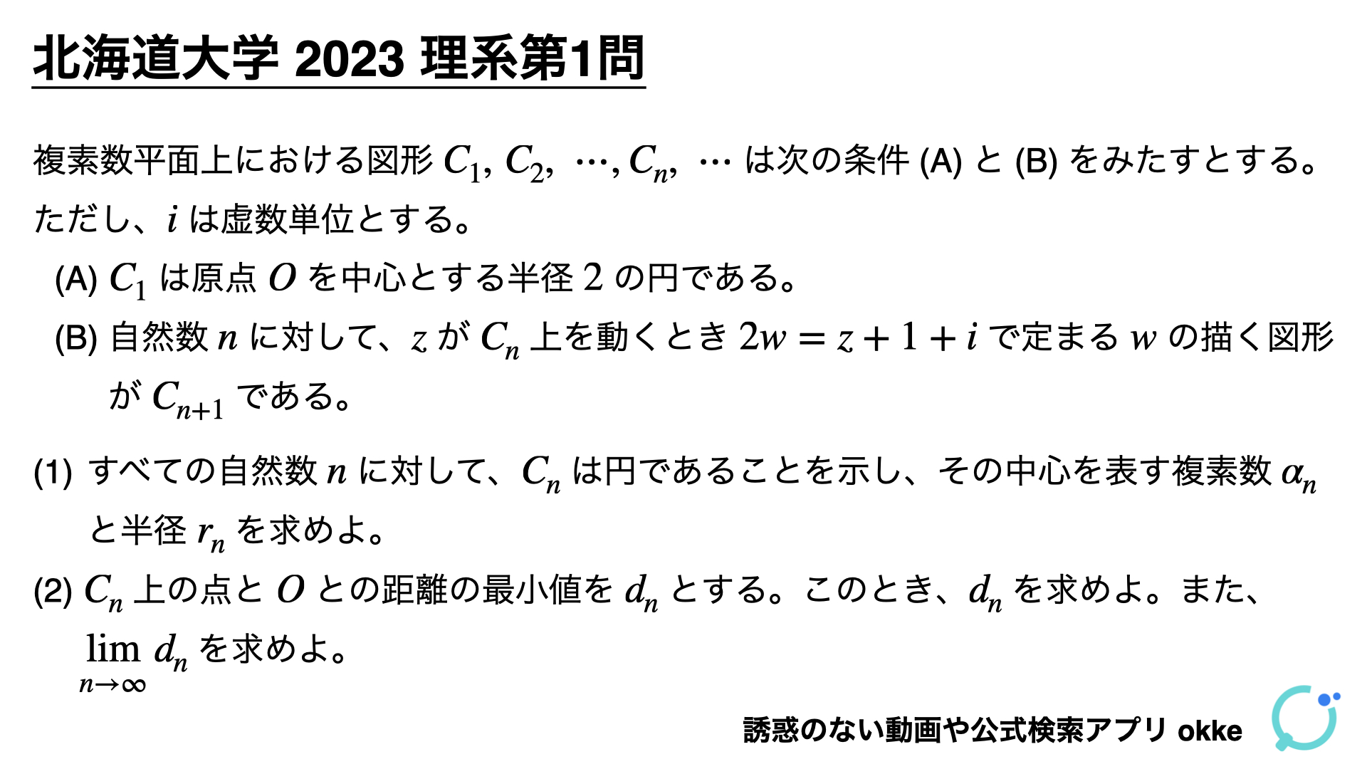 今日は、北海道大学2023年理系第1問の複素数平面の良問について、他の問題にも応用が効くように深くわかりやすく解説します。