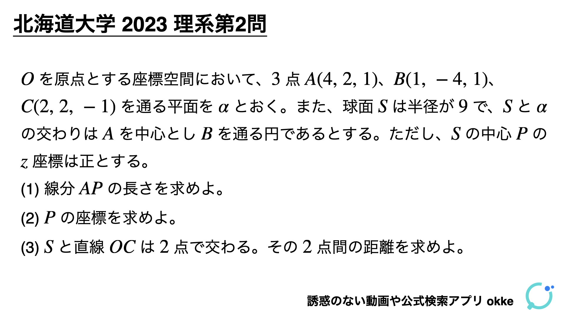 今日は、北海道大学2023年理系第2問の空間ベクトルの良問について、他の問題にも応用が効くように深くわかりやすく解説します。