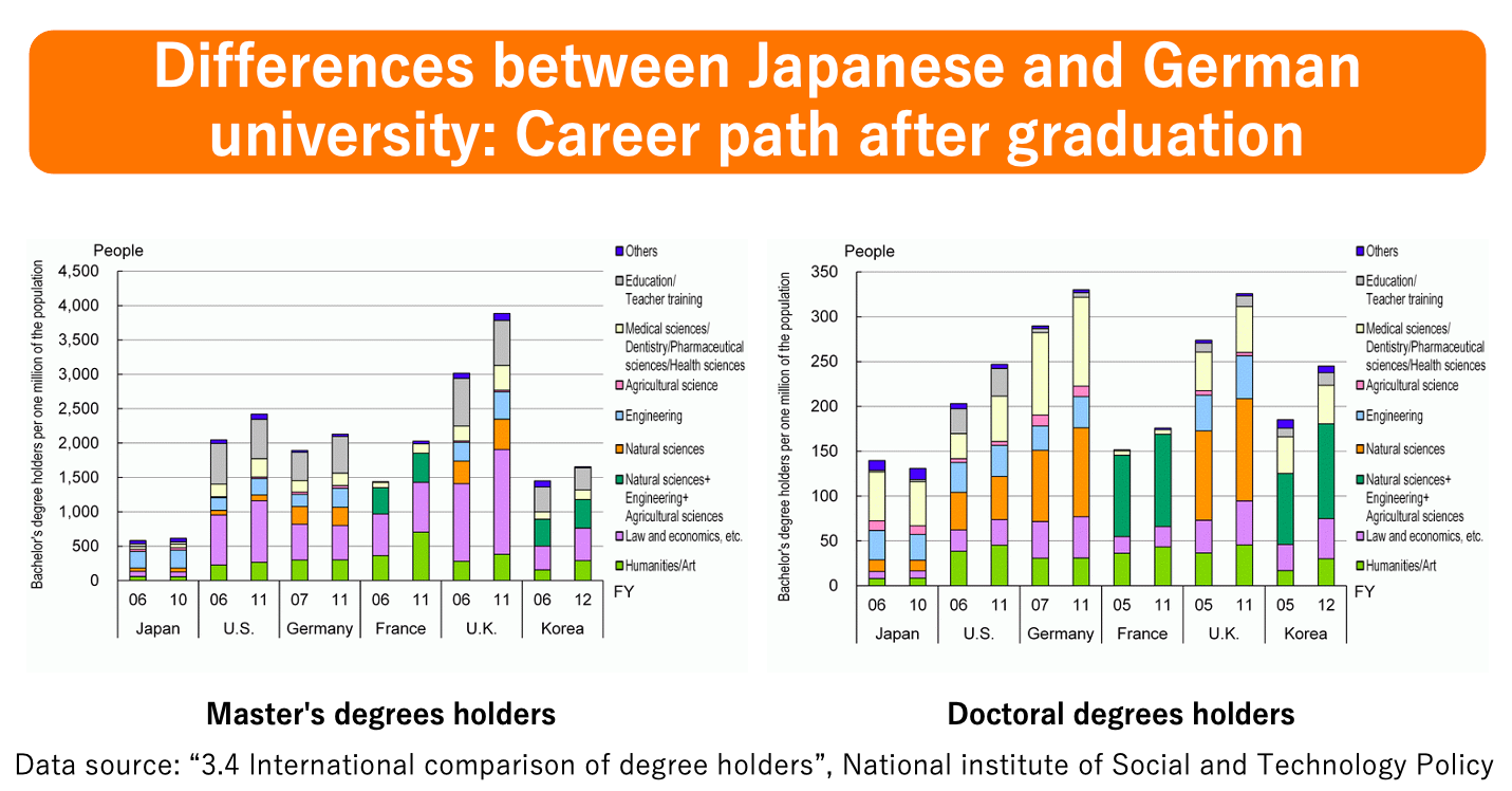 The third difference is the career path after undergraduate degree. In Germany and America, there are many more students who want to continue university after the Bachelor studies. I think in Japan most students just go to work. But in Germany, many people continue with master degrees or even PhD, even if they don't want to become professors. They do a PhD but then work for some company. So, the share of students doing graduate school and a PhD in Germany is much larger than Japan.