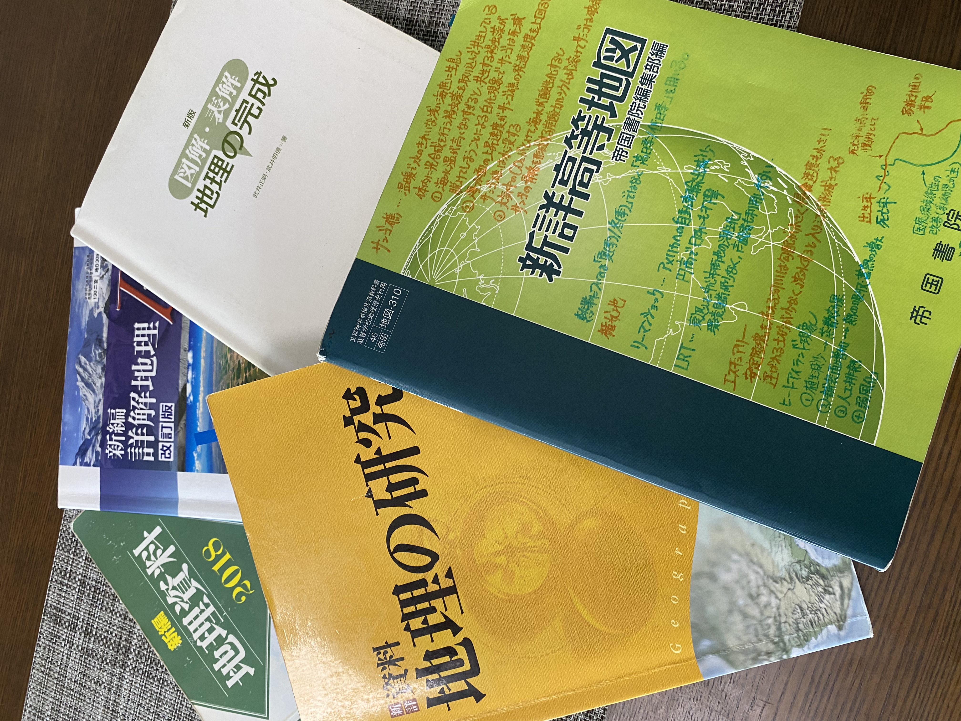 私は、地理の勉強を行う際には、こちらの5つのテキストを使用していました。高3の半ばからは、これに加えて赤本や青本も使用していましたね。はい、明らかに数が多いです。これらのテキストを常に持ち歩き、いつどこを勉強したのかをきちんと把握し、適宜復習を行うなんてのは、神業の領域に近いです。というか、不可能なんです。
