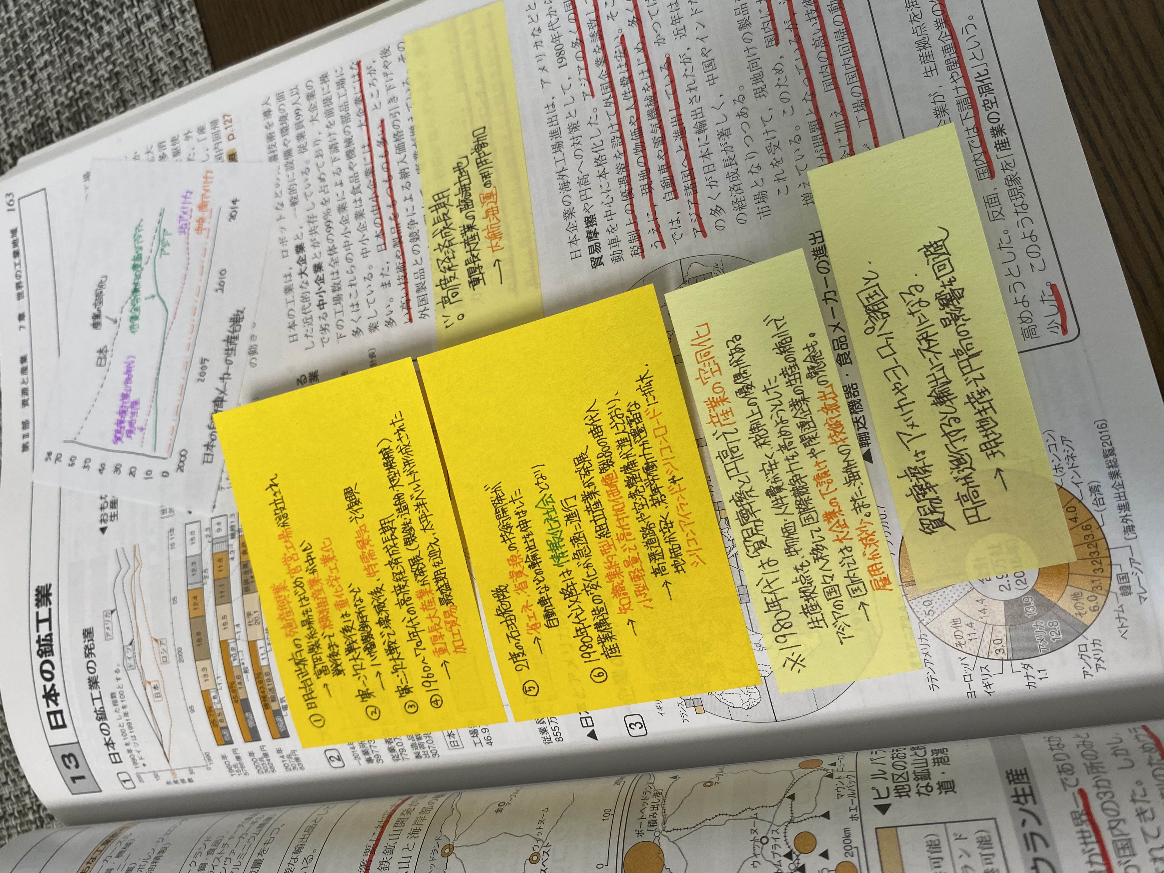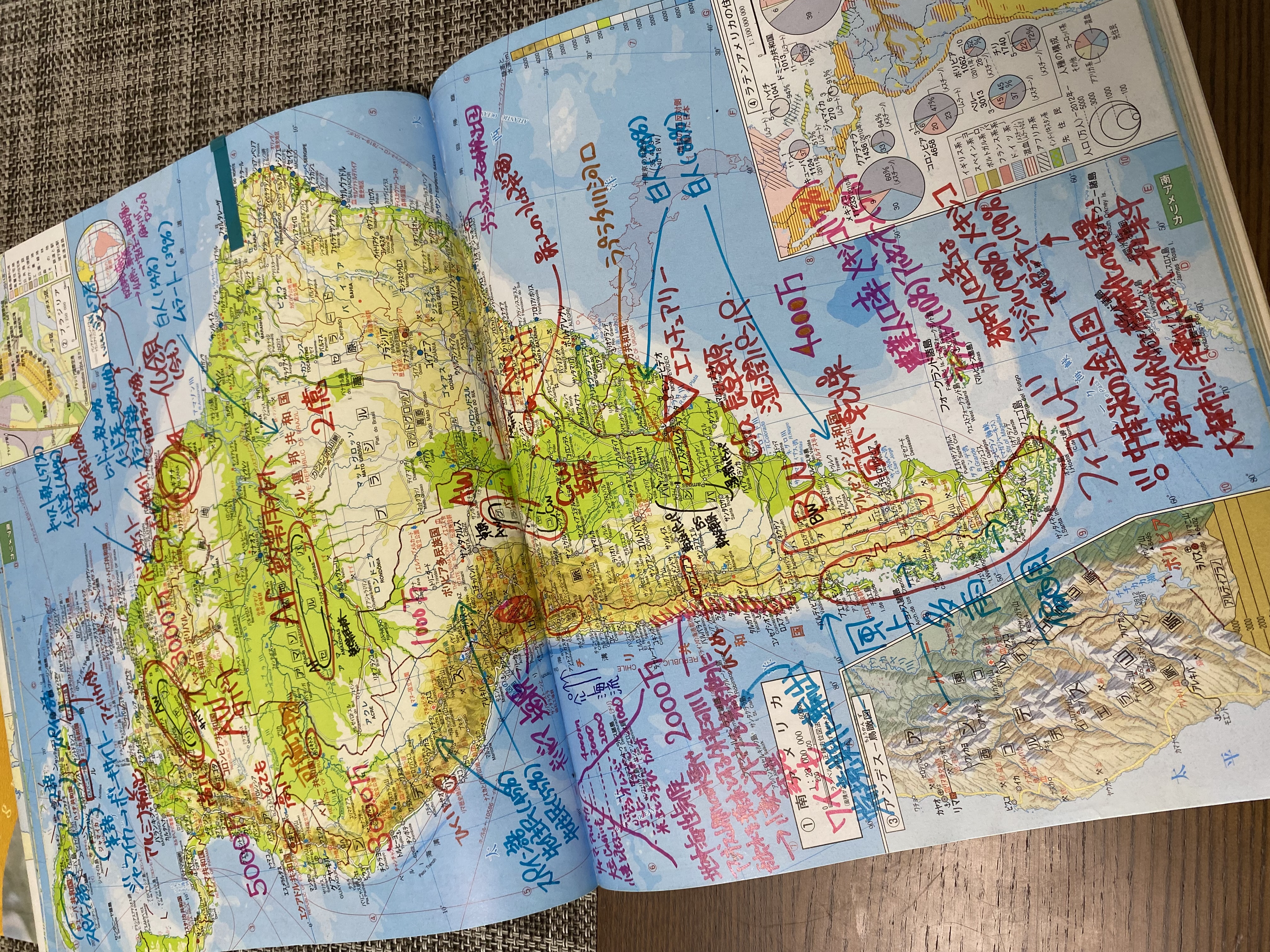 こうした時に「情報を集約する」ということが大切になってきます。私は、各テキストから得た情報を、地図帳と資料集のそれぞれに書き込み、「これをパラパラめくって、書き込みを追いかけるだけで、大方の復習が完了する」という状態を作りました。地図帳にはペンで直接書き込み、地図とリンクさせて復習できるように、資料集には付箋を貼って書き込み、単元ごとに要点を手早く復習できるように。