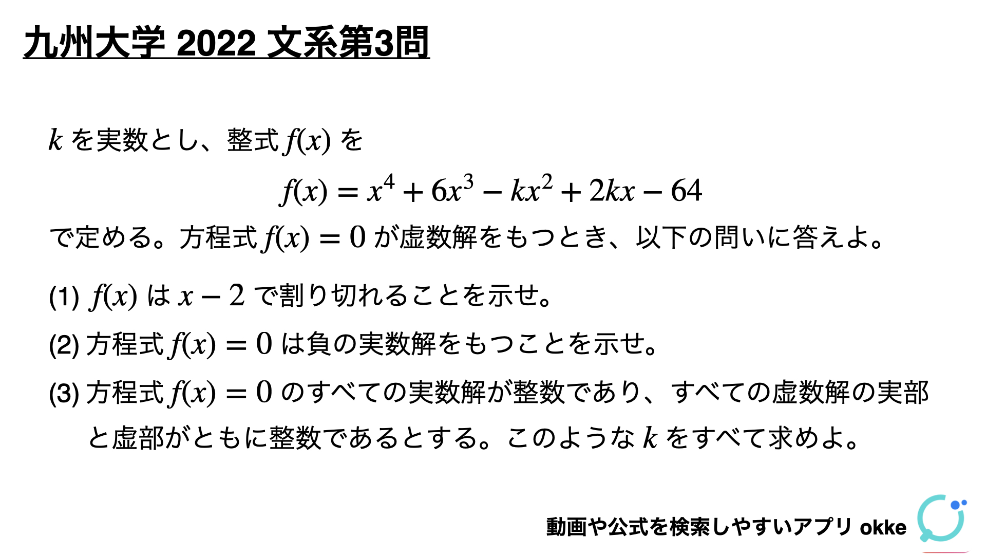 今日は、九州大学2022年文系第3問の高次方程式と整数の融合問題について、他の問題にも応用が効くように深くわかりやすく解説します。
