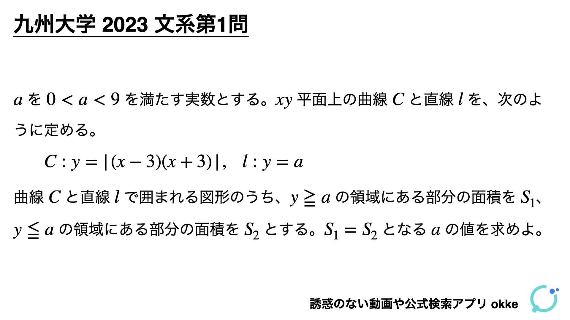 素直に求められていることをやろうとすると面倒で、処理の工夫が求められる良問です。面積そのものが求められているわけではなくて、あくまでも2つの領域の面積が等しい条件を問われているので、工夫のしがいがあります!