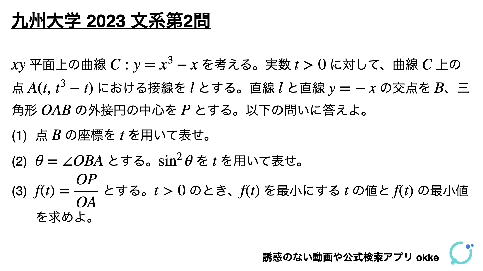 今日は、九州大学2023年文系第2問の図形絡みの融合問題について、他の問題にも応用が効くように深くわかりやすく解説します。