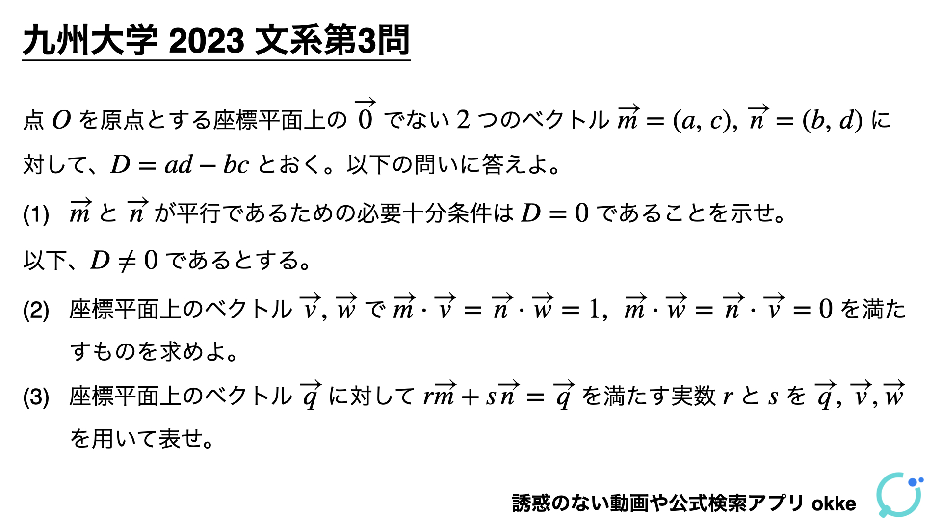 今日は、九州大学2023年文系第3問の平面ベクトルの問題について、他の問題にも応用が効くように深くわかりやすく解説します。