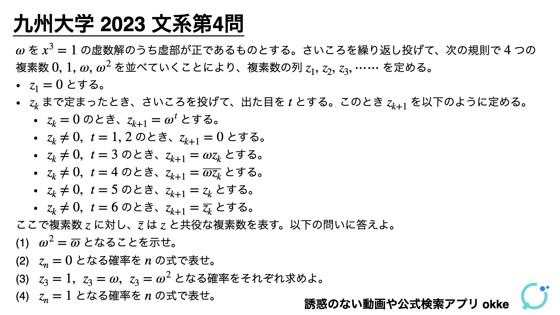 今日は、九州大学2023年文系第4問の複素数がらみの確率漸化式の問題について、他の問題にも応用が効くように深くわかりやすく解説します。