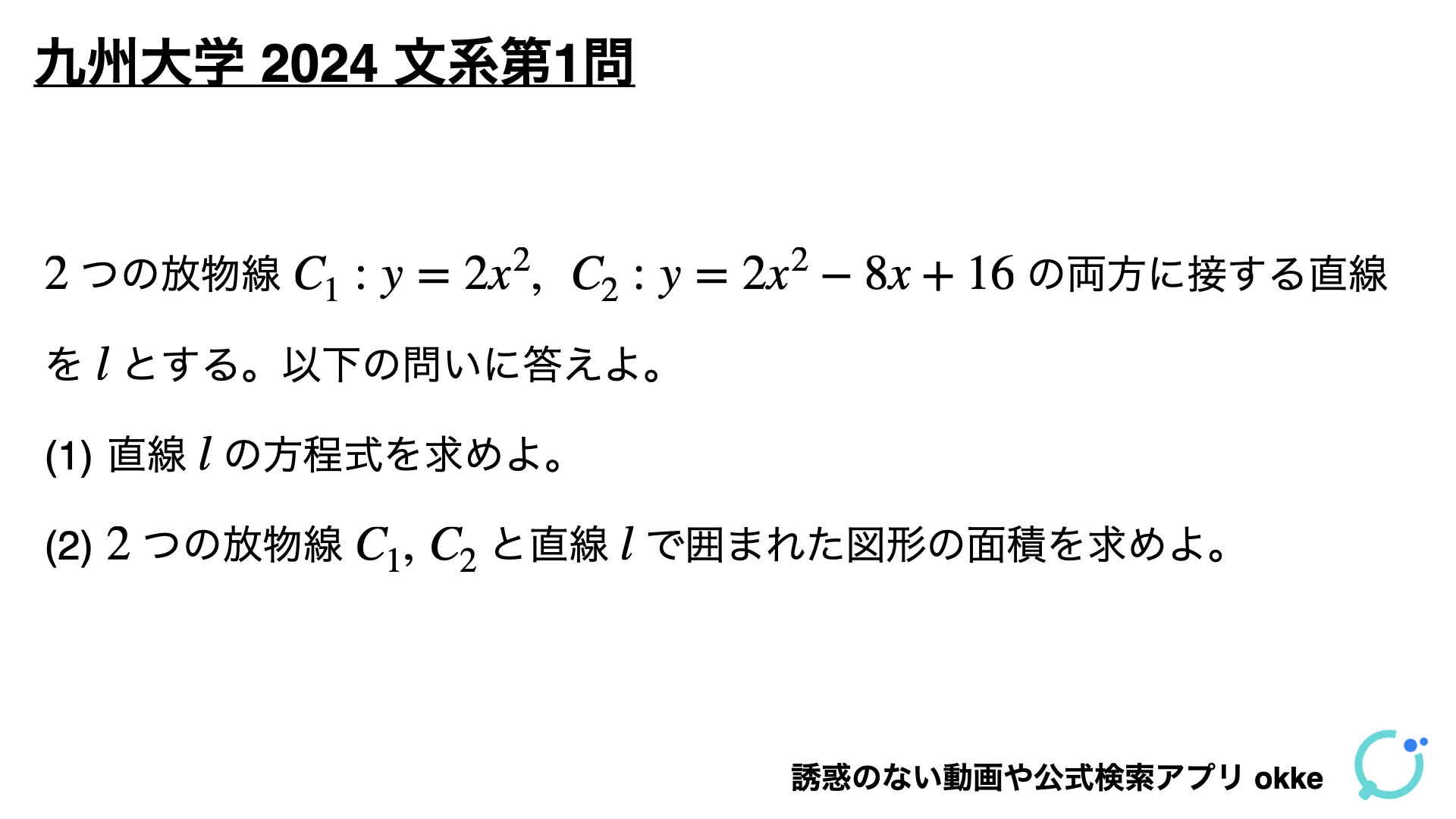 これはどの問題集でも出てくるテーマなので、必ず瞬時に方針を思いつけるようにしておきましょう!(共通接線については、動画内でより一般的に整理しているのでぜひ参考にしてみてくださいね)