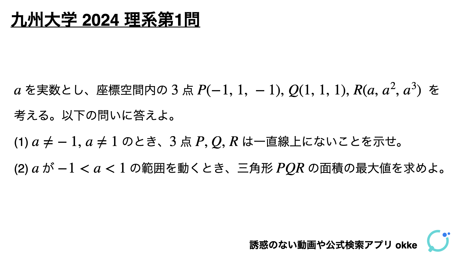 今日は、九州大学2024年理系第1問の空間ベクトルの問題について、他の問題にも応用が効くように深くわかりやすく解説します。