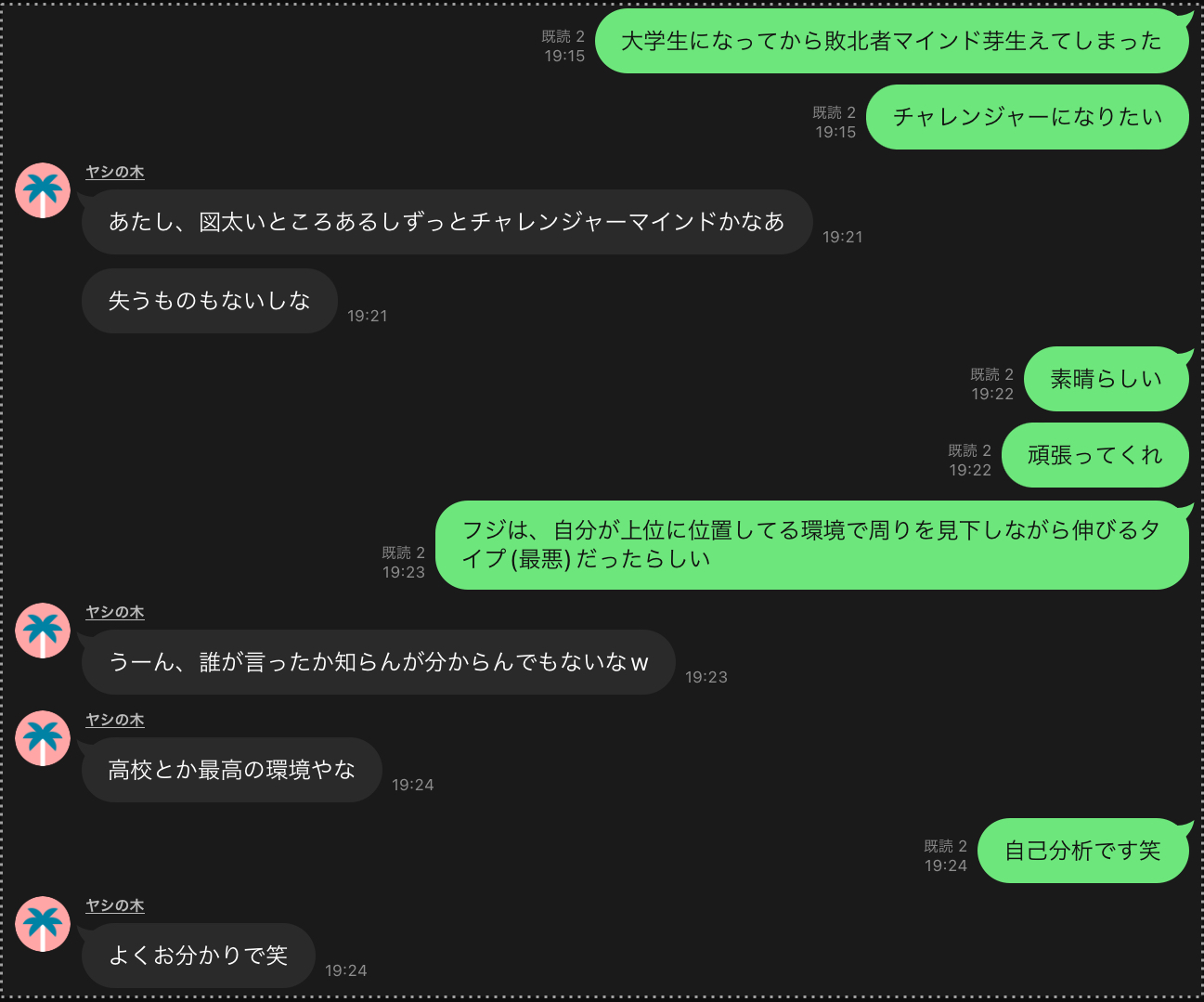 なんですが、私はかねてよりこの「負けマインド」のことを「敗北者マインド」と呼んでいて(LINEのやりとりを参照)、これについて実はこちらの記事でチラッとしてるんですよね。