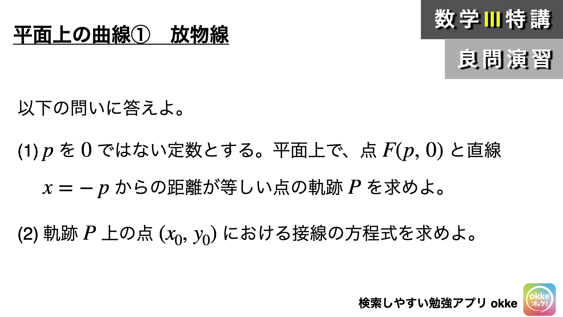 今日は68問目で、ついに平面上の曲線の単元に入ります。今回は放物線の基本性質についてです。