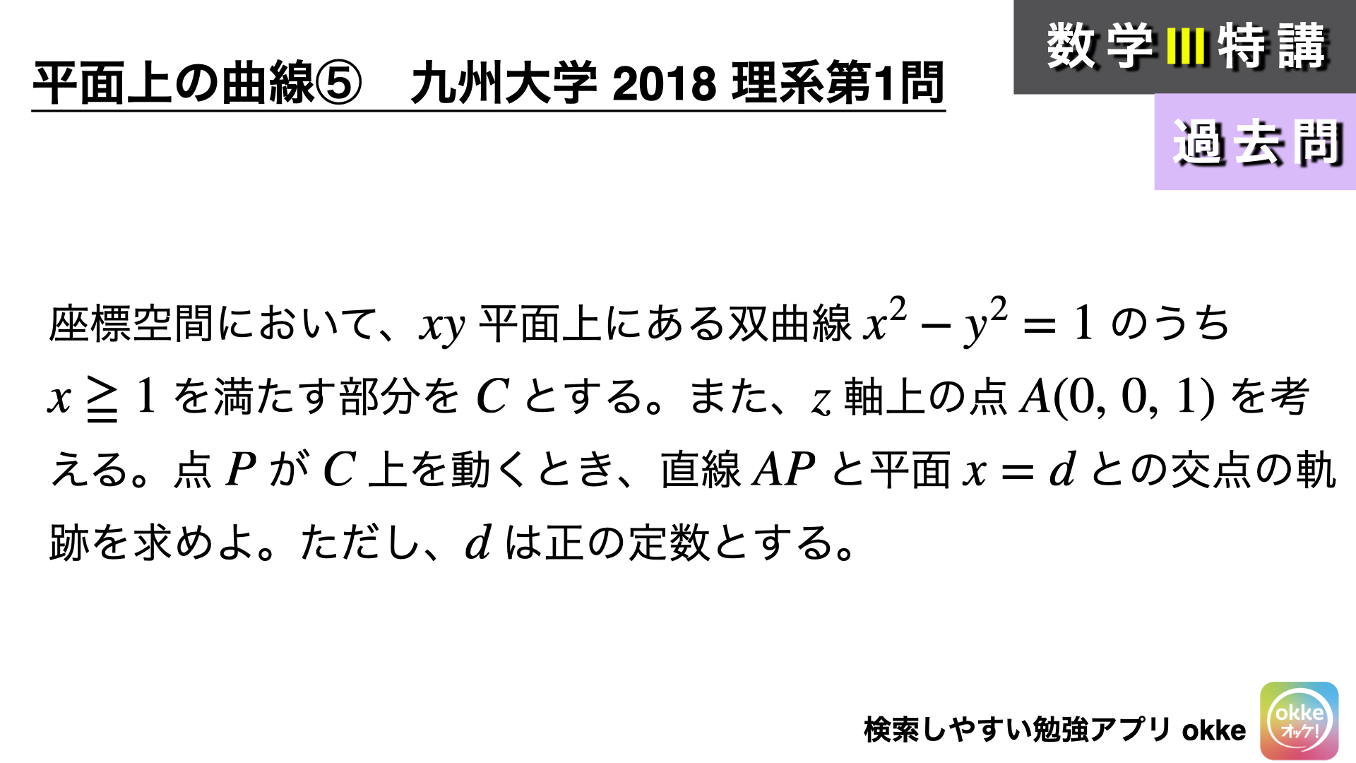 今日は72問目です。双曲線と絡めた、空間座標内の軌跡の問題です。