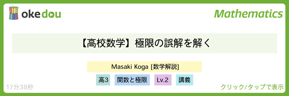 京大大学院で数学を専攻されている、古賀真輝さんによる、極限について深く理解できる動画です。応用力をつけるためにも、limの定義からしっかりと押さえましょう。極限は代入ではないですよ!