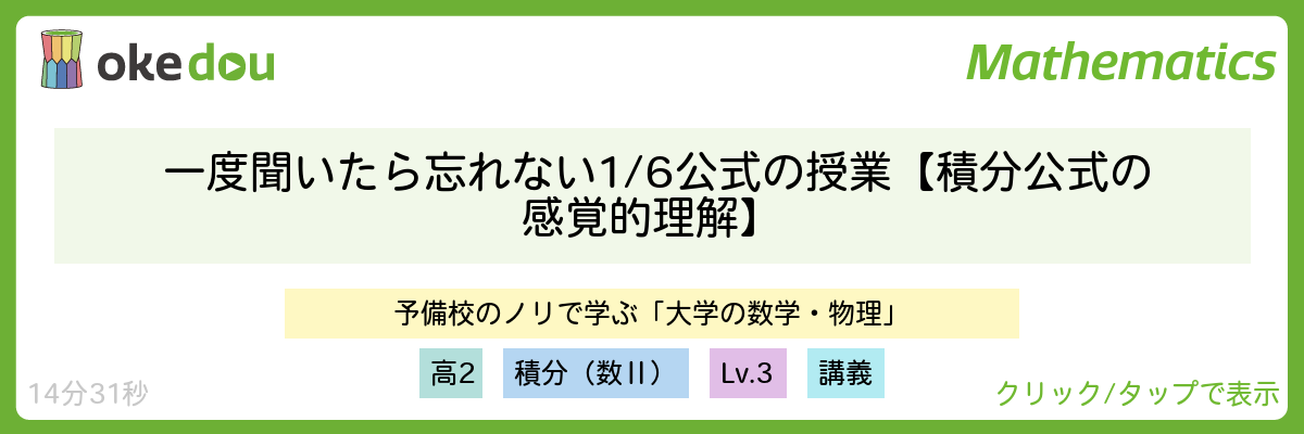 東大大学院卒のヨビノリさんが、放物線の面積公式、いわゆる「6分の1公式」について証明+見方を丁寧に解説されています。文系理系問わず本当によく出てくるテーマで、応用できると積分の計算がどんどん楽になっていきますので、受験生の方は一度確認しておきましょう!