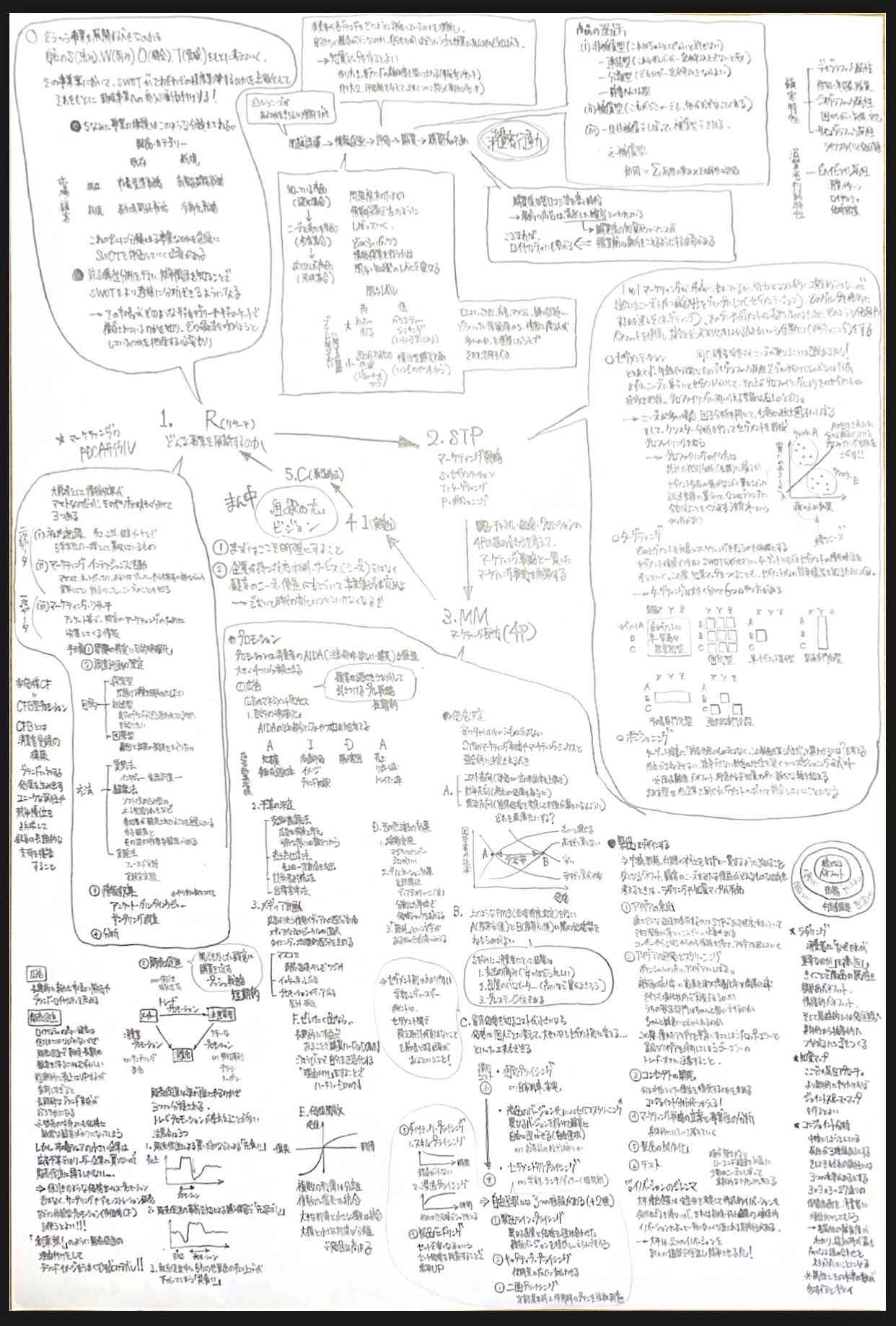 私はいまでも、大学の期末テスト対策なんかでよく「まとめる」勉強法を使っています。直近だと、マーケティングという授業の期末テスト対策でこんなものを作りました。参考書150ページ分が試験範囲だったので、それの内容をプリント1枚にまとめたって感じ。見直しをすればなおよしなのは間違いありませんが、まとめるだけも、150ページ分の内容が綺麗に整理されて、さらに時間をかけて作成している分ある程度記憶にも焼き付くので、試験対策としてはこれ以上ないほどに有用です。
