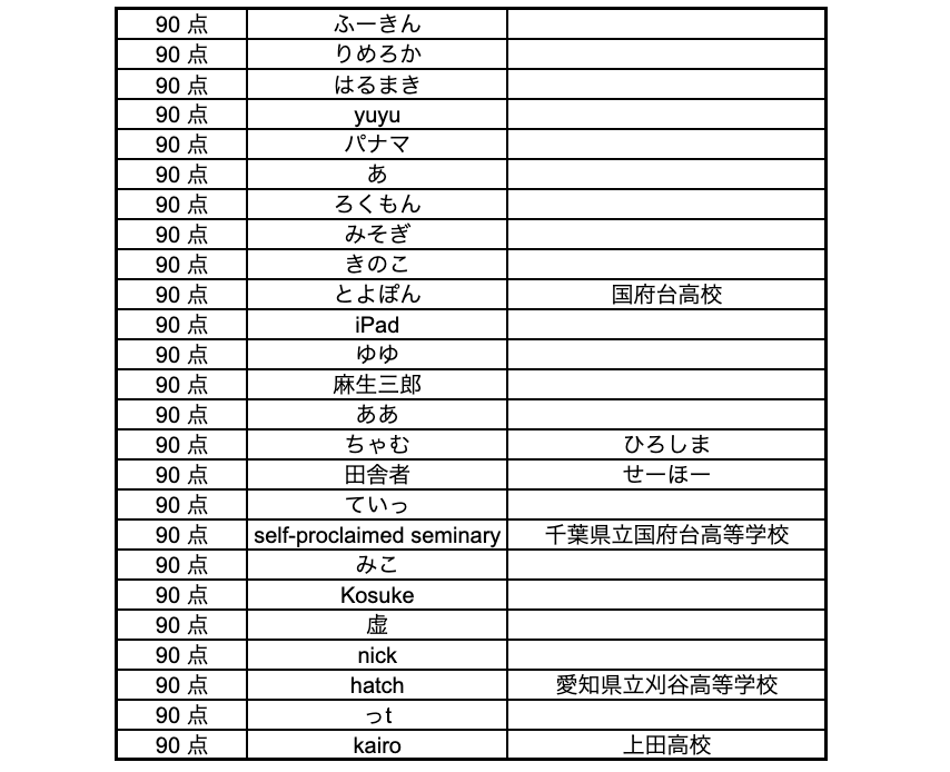 では次に、90点以上獲得していた方々を紹介します!(同点の方々は回答が早かった順になっています!)