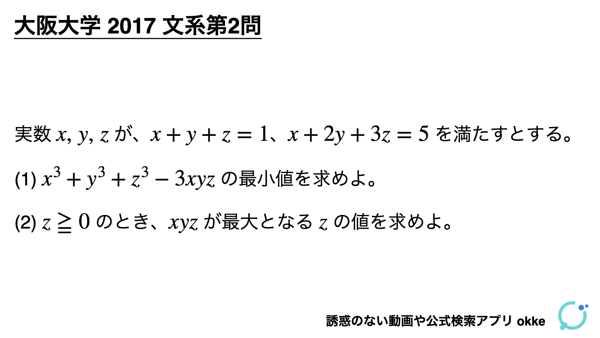旧帝大の理系でも文系でもしょっちゅう出てくる、多変数関数の最大最小問題です!このテーマは、問題集などではあまり整理されていませんが、考え方の整理がとにかく大事なので、動画を通じて頭をスッキリさせてみてください。