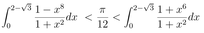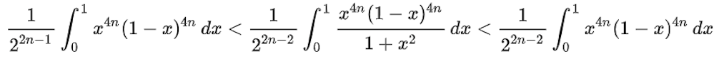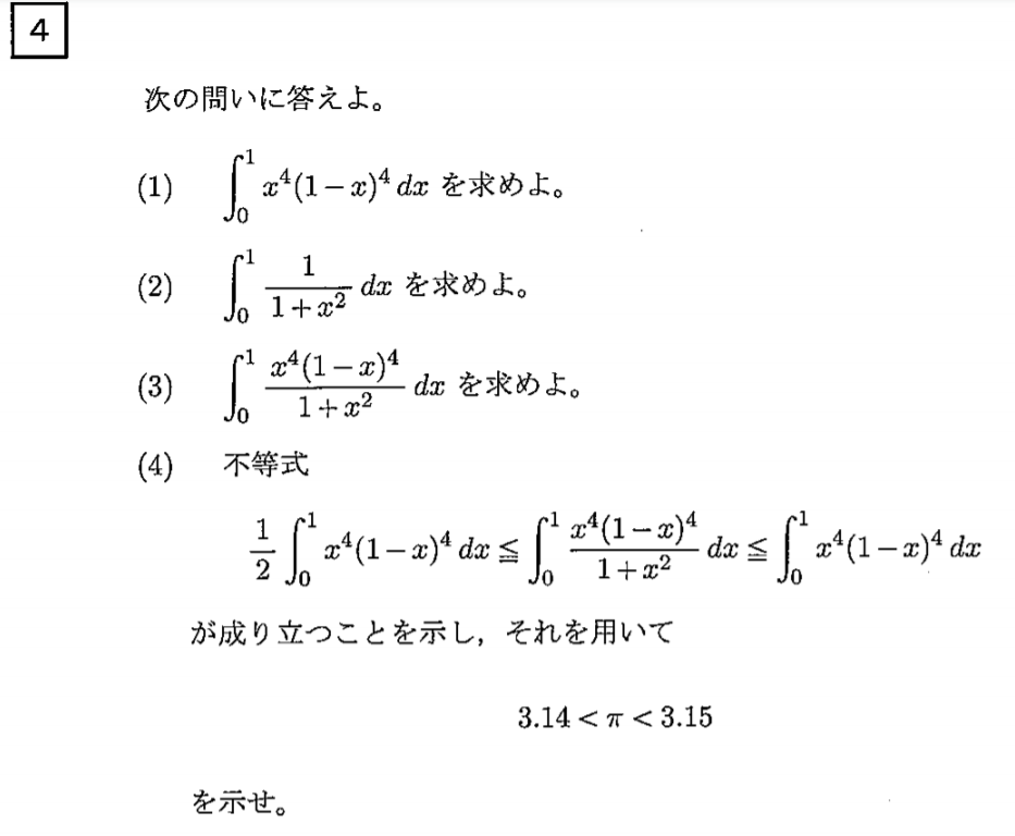 この問題はあまりよく知られていない問題ですが、取り扱われている不等式は円周率が22/7より小さいことの証明としてよく知られています。