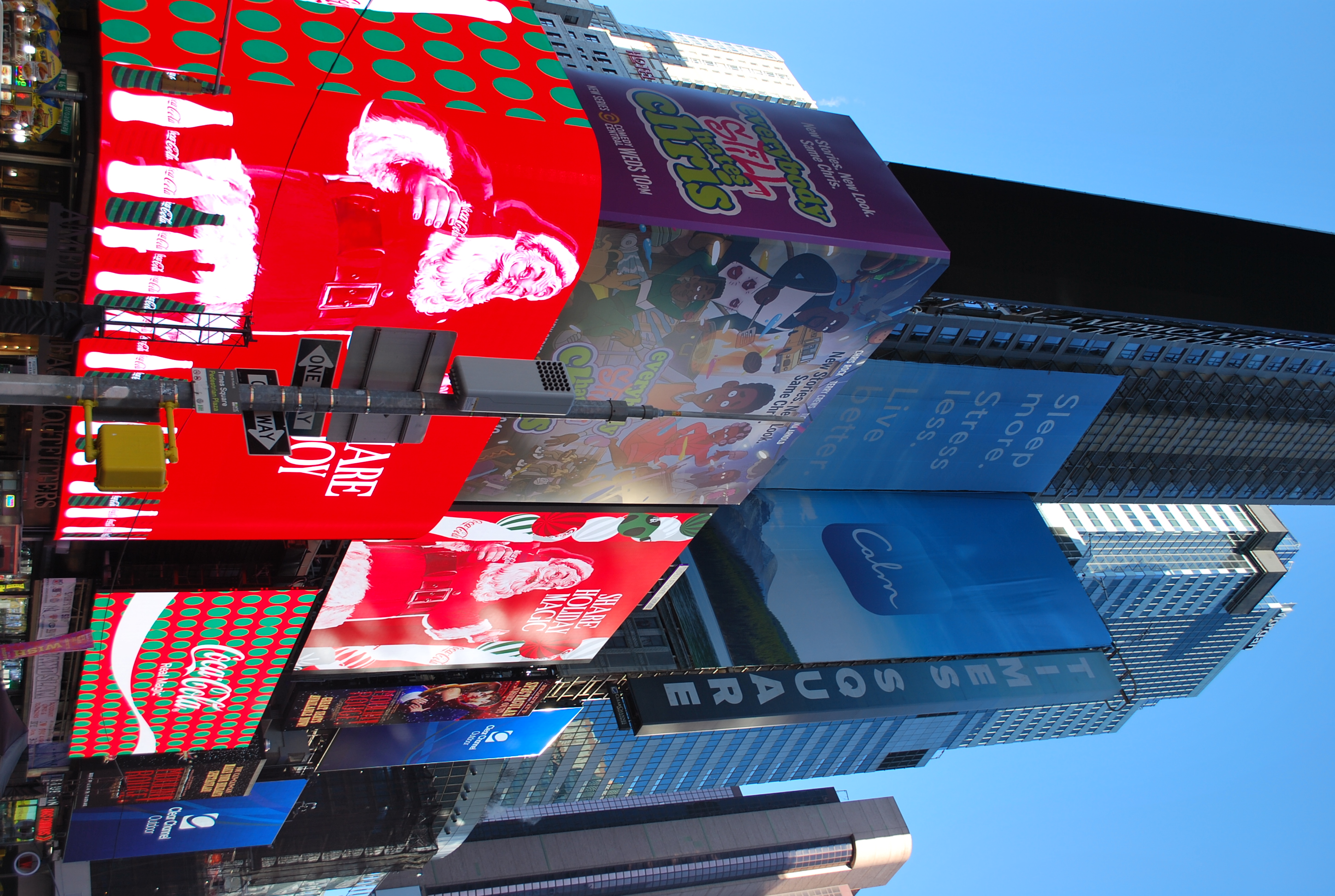 いちばん有名なのはタイムズスクエアでしょうか。タイムズスクエアは御存知の通り巨大広告スクリーンがたくさんあり、まさに世界の中心地のような街でした。