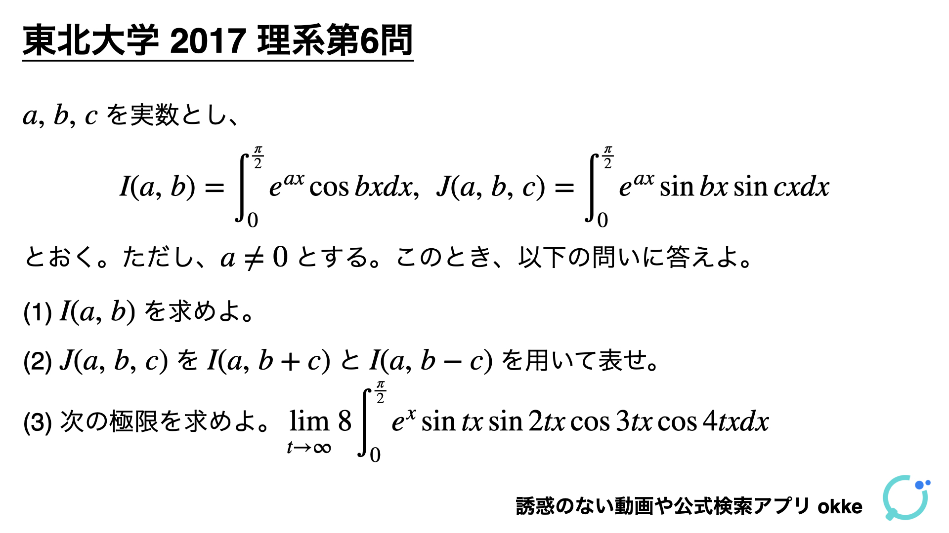 今日は、東北大学2017年理系第6問のシンプルな積分の問題について、他の問題にも応用が効くように深くわかりやすく解説します。