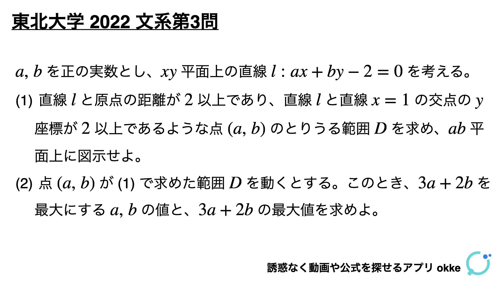 今日は、東北大学2022年文系第3問の領域上の最大最小の問題について、他の問題にも応用が効くように深くわかりやすく解説します。