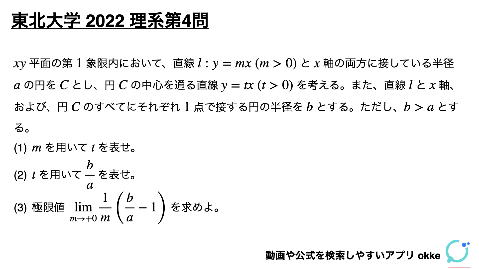 今日は、東北大学2022年理系第4問の図形と方程式・極限の融合問題について、他の問題にも応用が効くように深くわかりやすく解説します。