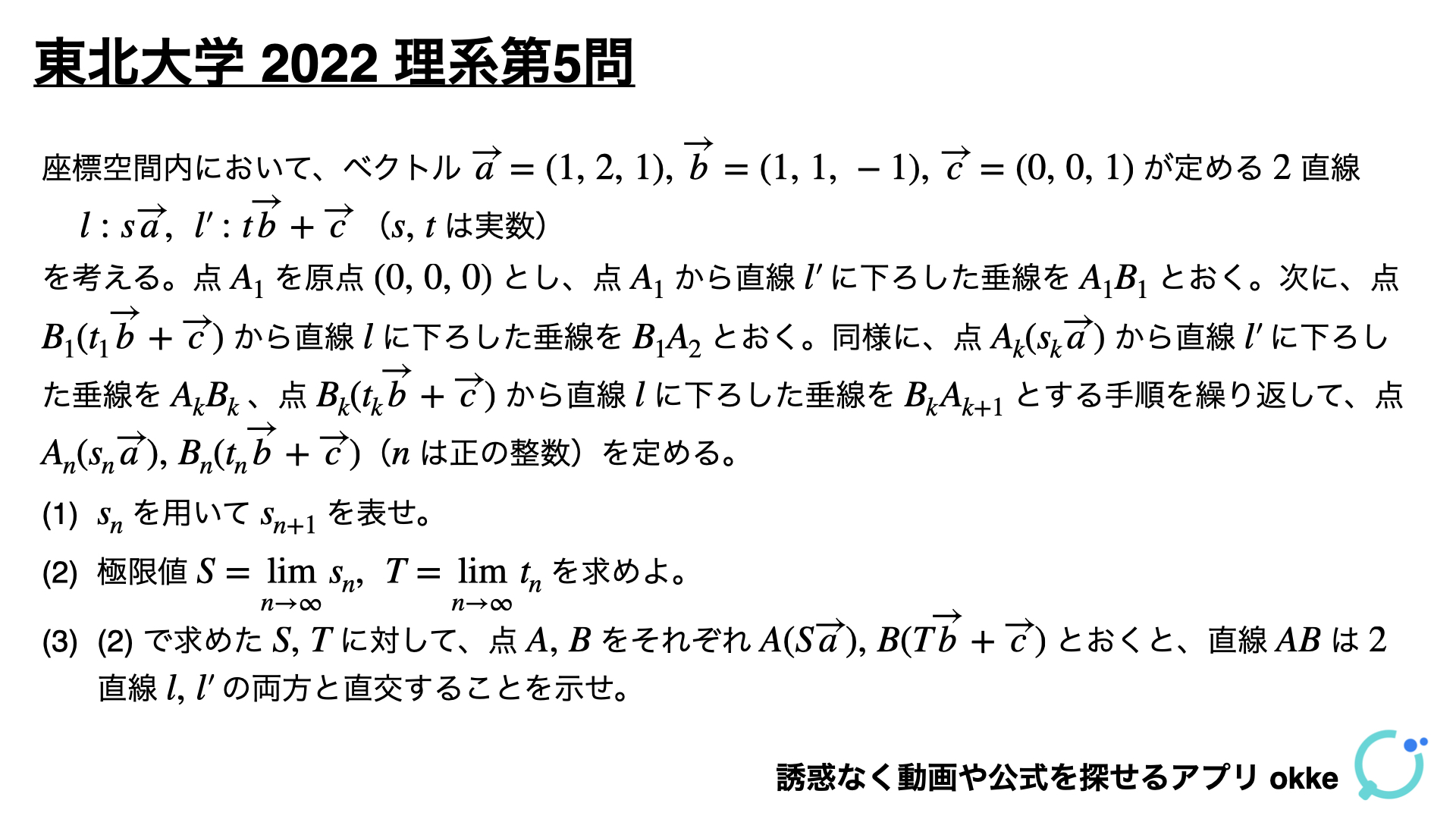 今日は、東北大学2022年理系第5問の空間ベクトルと極限の融合問題について、他の問題にも応用が効くように深くわかりやすく解説します。