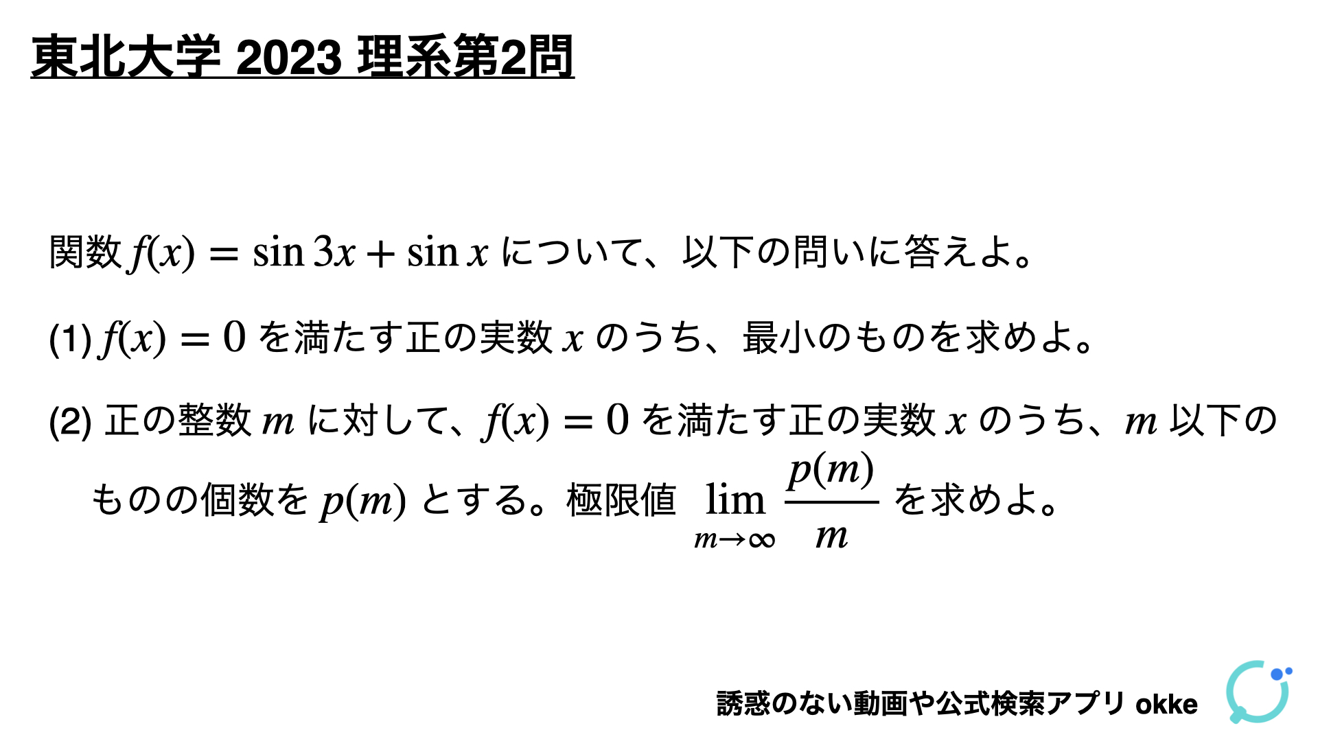 今日は、東北大学2023年理系第2問の極限の問題について、他の問題にも応用が効くように深くわかりやすく解説します。