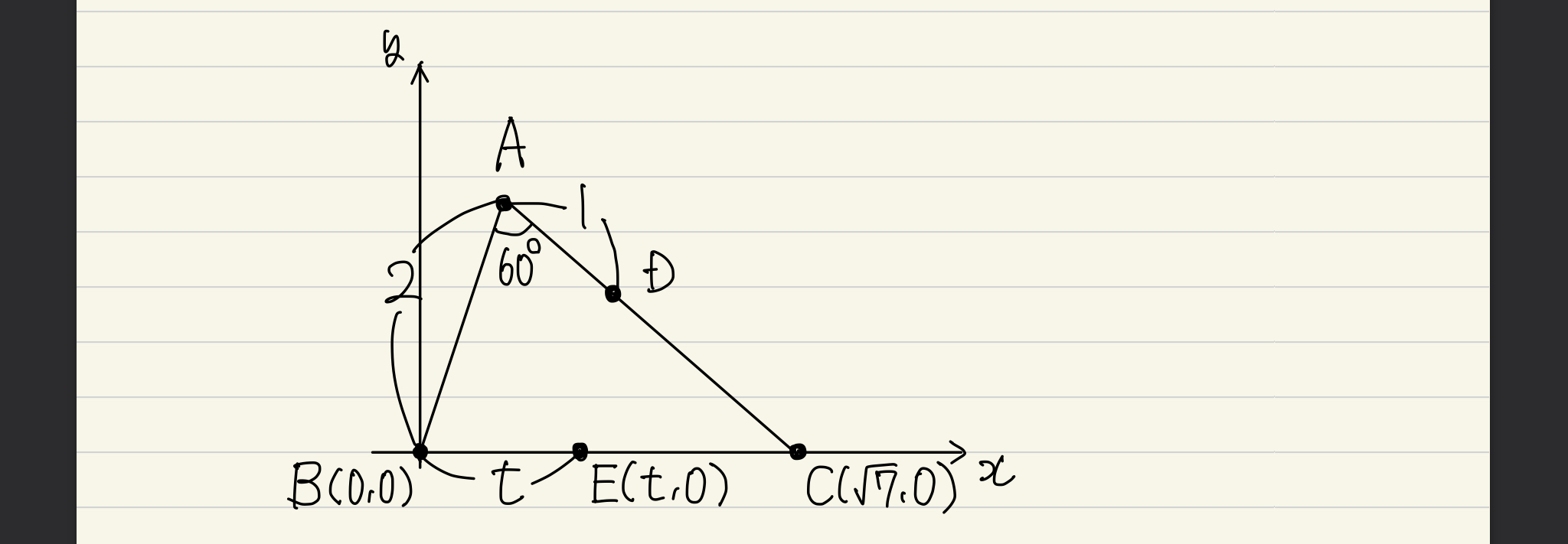 この問題であれば、点Eですよね。(2)(3)を見ると線分BEの長さを求めることになりそうなので、余弦定理で辺BC=√7を求めた上で、以下のように、点Bを原点に据えてかつ点Eがx軸上に来るように座標平面上に落とし込めたら、それが理想な気がします。