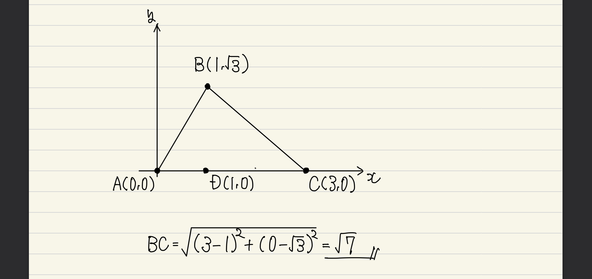 このように配置してやれば、全ての点の座標をすんなりと求めることができますね(点Bの座標は、ABの長さが2ということと、∠BAC=60°から求めましょう)。というわけで(1)はBC=√7です。