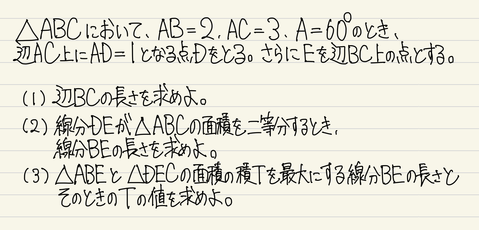 さて、今回の問題は、三角比を用いて解くことを想定されたような雰囲気。ですが、AB=2でAC=3、そして∠BAC=60°と言われると、△ABCの形は決まっているので、「座標に落とし込みやすいじゃん!」という気持ちになるわけです。ではさっそく、座標で考えてみます(以下の解説を読む前にぜひ自力で挑戦してみてくださいね)。