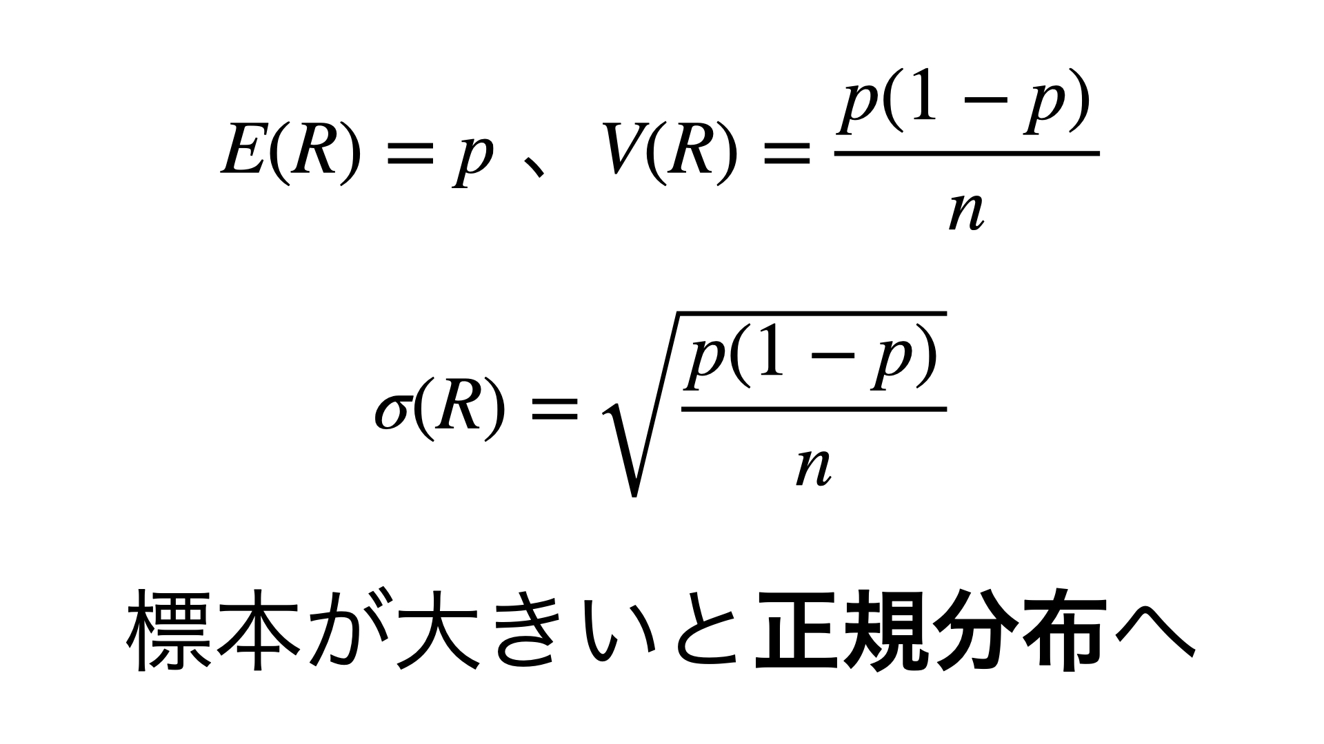 この統計的な推測の最終目標は母比率の推定で、最後はかなり難解な式が出てきますがこの式を丸暗記するのではなく、式の意味が味わえるように一から体系的に学習していきます。全ての動画を見終えた後には統計学の面白さがわかり、式の意味するものが味わえるようになります!頑張って最後まで見てください!それではレッツ!オモワカ!!
