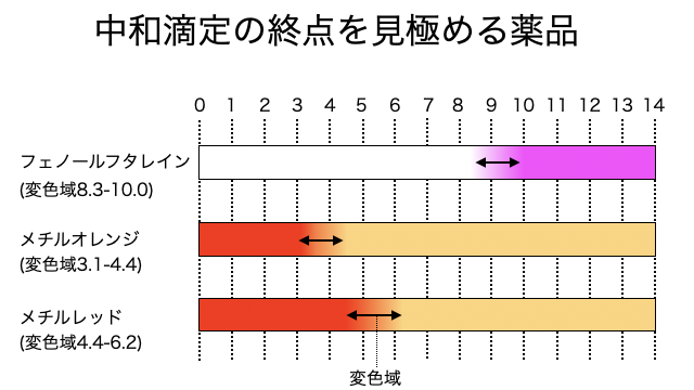 フェノールフタレインやメチルオレンジなどの指示薬の紹介、ビュレット・メスフラスコ・ホールピペットなどの器具の説明などしています。あまり丸暗記をするのではなく、操作に必然性を感じましょう。