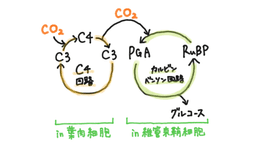 語呂「焼肉しよーん。よい肉固定!(C 4植物、葉肉細胞で二酸化炭素固定)」無理矢理ですね。すみません。