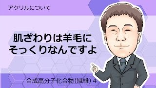 アクリルは「ナイロン」「ポリエステル」と並ぶ三大合成繊維であります。アクリルはモノマーとしてアクリロニトリルという物質を用います。羊毛に似た軽くて肌ざわりが良い利点がありますが、染色性がよくないという欠点もあります。この部分は他に別の種類のモノマーを加えて共重合することで解決されています。また、塩化ビニルとの共重合体は防炎性にすぐれ、防炎カーテンはカーペットに使用されています。