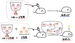 ●S型菌は莢膜(きょうまく)という鎧のような構造を持ち、白血球から逃れる。よって、S型菌はマウスに肺炎を起こす。対してR型菌は莢膜を持たず、肺炎を起こす能力はない(マウスの白血球に排除されてしまう)。