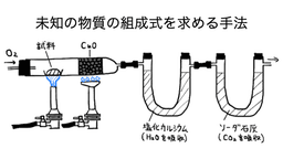 有機化合物を完全燃焼させて得られた二酸化炭素と水の質量から、有機化合物中の炭素・水素・酸素の質量を求めます。